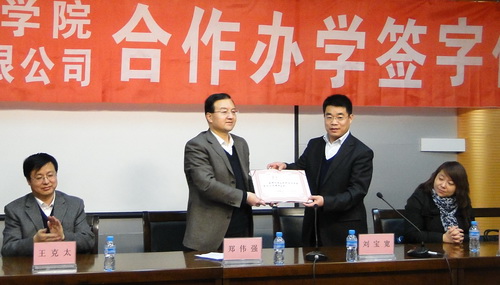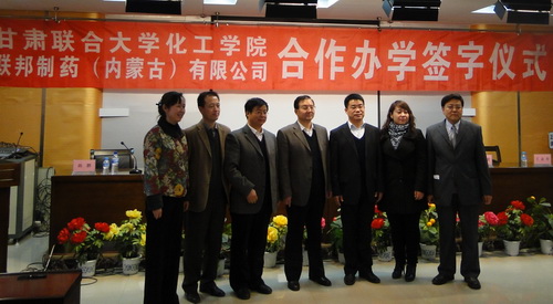 刘宝宽副总经理代表联邦制药(内蒙古)有限公司致辞。表示很高兴与甘肃联合大学合作办学、共建实习基地,同时表示要为学生就业实习搭建平台,努力实现学校、企业和学生的多赢。接下来在热烈的掌声中,王克太院长与刘宝宽副总经理代表双方在《校外实训实习基地合作协议书》、《订单式学生培养协议书》上签字。郑伟强副校长在签字后讲话说,今天,双方合作迈出了坚实的一步,合作办学、联邦制药班的开班必将促进我校专业建设和实习就业,相信在双方的精心培育下必定能结出丰硕的果实。最后,郑伟强副校长代表学校向刘宝宽副总经理颁发了兼职教授聘书。