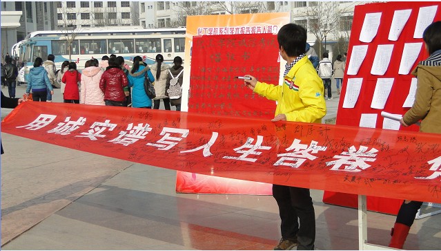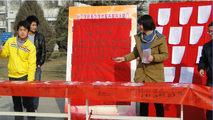 (三)12月22日,开展了诚信考试签名活动,学生们在横幅和各班级印制的签名书上纷纷签了名,表示要诚信考试,杜绝作弊。