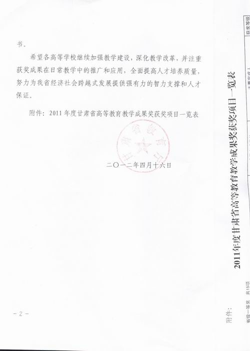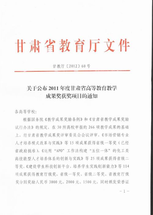 近日,甘肃省教育厅公布了2011年度甘肃省高等教育教学成果奖获奖项目名单,全省30所高校申报的266项教学成果中有154项成果获奖。我院院长王克太教授主持完成的《运用“APO”工作法构建“五位一体”的化工类高技能型人才培养体系的创新与实践》获省级二等奖。