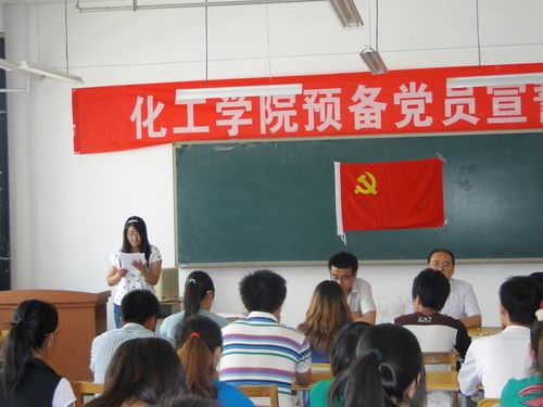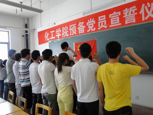 宣誓仪式在庄严国际歌声乐曲声中开始,30名预备党员在09级党员黄霖同学的带领下,举起右拳,面对党旗宣誓:“我志愿加入中国共产党,拥护党的纲领,遵守党的章程,履行党员义务,……为共产主义奋斗终身,随时为党和人民牺牲一切,永不叛党。”在这个神圣的时刻,新党员在党旗下的誓言,将是他们今后行动的号角,他们政治生命中的一座里程碑,也是一个新的开始。宣誓仪式是一次深刻的思想教育活动,参加仪式的入党积极分子也接受了心灵的洗礼。