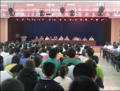 9月7日下午,红足1世足球网址大全在萃文厅隆重举行2012级开学典礼暨新生见面会。校长助理、学院院长王克太、党总支副书记、副院长张兴辉、副院长展惠英、责任教授李欣及部分教工、400余名新生参加了大会。