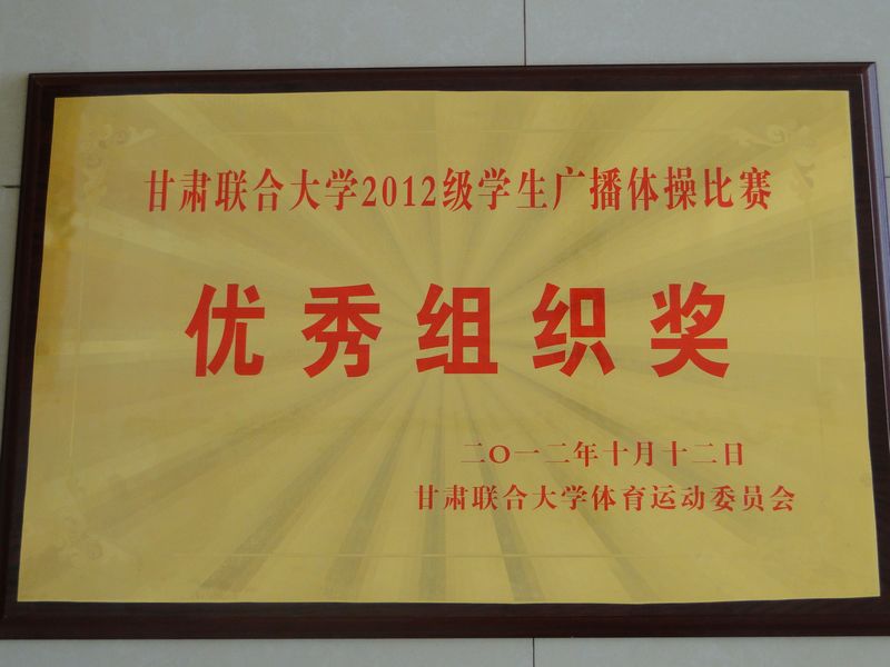 2012年10月12日下午,甘肃联合大学2012级广播体操比赛在学校第一运动场举行, 10个院系的代表队参加了比赛。此次比赛的目的是为了规范广播体操动作,进一步弘扬“自主,强身,健体”的体育精神,展示学生风采面貌,同时培养学生团结协作的集体主义精神。