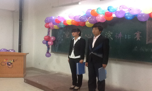 12月16日晚,12级应用化工技术四班团支部“党在我心中,喜迎十八大”大型演讲比赛总决赛在3号楼304教室顺利举行。由12级应化四班班主任王子宜老师、团学办辅导员李睿老师及学生会主席团相关人员等受邀担任评委。