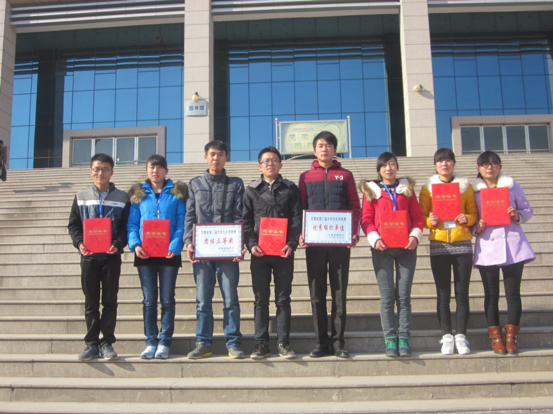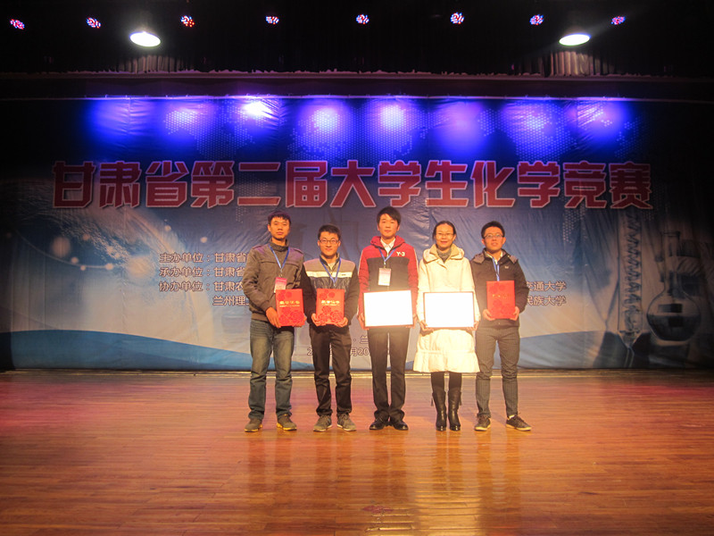为促进化学教育教学新思想与新方法的交流,普及化学基础知识,激励大学生接触化学发展的前沿,培养大学生学习化学的兴趣爱好、创新意识、创新思维和创新能力,由甘肃省教育厅主办,西北师范大学和甘肃省化学会承办的甘肃省第二届化学知识竞赛于2014年12月19至21日在西北师范大学举行。兰州大学、西北师范大学、西北民族大学、甘肃农业大学、兰州交通大学、兰州理工大学、河西学院、兰州城市学院、陇东学院、天水师范学院和我校等11所省内高校共计160余人参加了竞赛。