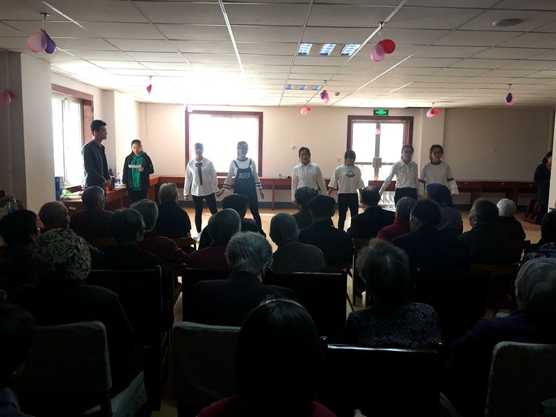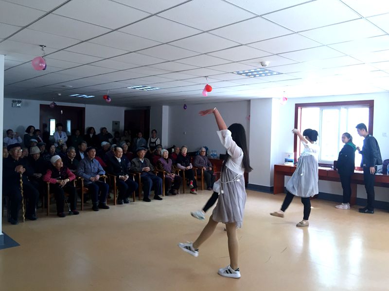 本次文艺演出由同学们自编自演,在一个小时的倾情演出中,同学们演绎了充满青春活力的健身操《舞动青春》、歌曲《外婆的澎湖湾》、《我只在乎你》、中国风舞蹈《宫商角徵羽》等,期间还穿插安排了互动小游戏“你比划我来猜”、“成语接龙”、“夹弹珠”等,老人脸上洋溢着满足的笑容,嘹亮的歌声,优美的舞蹈将浓浓的爱心注入到每个老人的心中,同学们的精彩表演赢得了老人们的阵阵掌声,伴随老人们度过了快乐美好的一天。