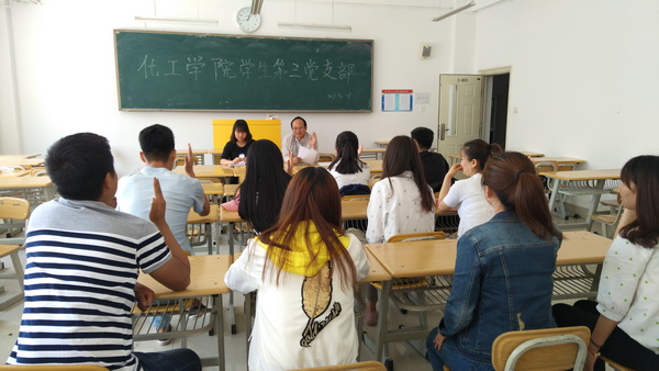 大会既定议程结束后,被党组织新接收的预备党员在学生一支部副书记李大伟同学的带领下,面对鲜艳的党旗,举起右拳,庄严宣誓。宣誓仪式结束后,学生第一支部书记雷芸老师、学生第二支部书记杨全录老师、第三支部书记牛腾老师对新发展的党员提出了要求与希望。要求他们从此刻起,以共产党员的标准严格要求自己,加强理论学习。希望他们严格遵守党章党规,热情为同学服务,努力当好学生表率,不断提高自己的综合素质。