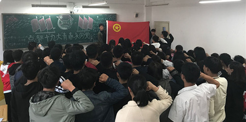 活动在嘹亮的团歌中拉开了帷幕,随后分三个部分展开。在学习、畅谈十九大报告环节,李卉老师带领全体同学从十九个方面认真学习了党的十九大报告精神。学生代表畅谈聆听感受感想和学习心得体会。17级应用化学2班丁小刚等学生干部表示,总书记的报告振奋人心,为自己生活在这个时代感到骄傲。在大学生活中更要发挥好带头作用,用自己的行动影响带动周围的同学共同进步。