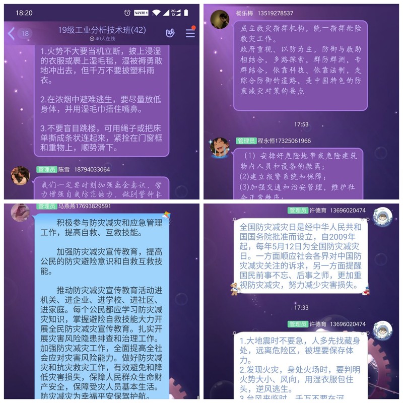 学院通过QQ班级群、微信宣传等方式,加强开展 “防灾减灾日”宣传,全院各班级利用腾讯会议APP开展防灾减灾主题班会,普及洪涝、地震、风雹等各类灾害以及公共卫生安全、生产安全、火灾、燃气泄漏等事故的知识和防范应对技能,提高学生的自救自护能力。各班通过开班会,制作手抄报,撰写学习心得等方式加强同学们对防灾减灾安全的认识。同时学院利用学院官网加强和普及防震减灾相关知识,学习发生灾害时如何进行自我保护、预防的常识和技能。