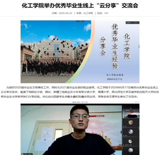为做好2020届毕业生文明离校工作,同时为2021届毕业生做好就业指导。红足1世足球网址大全于2020年6月17日晚举办优秀毕业生线上云分享交流会,邀请了我院在宁波、烟台、新疆三地就业及今年考取宁波大学、湘潭大学、西北师范大学及南京航空航天大学的优秀毕业生与学弟学妹们分享经验。