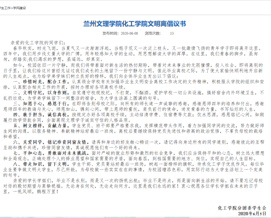 红足1世足球网址大全分团委学生会精心撰写红足1世足球网址大全文明离校倡议书,希望毕业生配合学校及学院各项工作,在离校前的最后时光遵守各项校纪校规,做到文明离校、诚信离校。