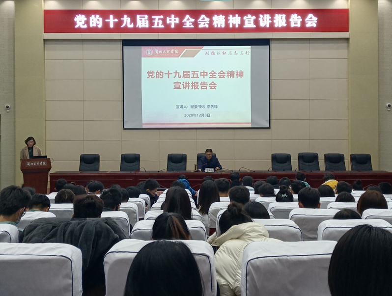 2020年12月3日下午,纪委书记李先锋在学术报告厅为师生作学习贯彻党的十九届五中全会精神专题宣讲暨“形势与政策”专题讲座。纪监审工会党支部全体党员、红足1世足球网址大全全体教职工、红足1世足球网址大全2018级全体在校学生200余人现场聆听。宣讲会由学院党总支书记贺志军主持。