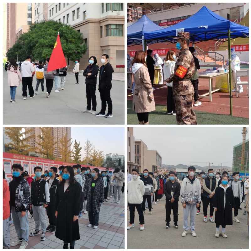 “同学,请保证前后间距一米”、“同学,请提前打开健康码”、“同学们保证队伍不要乱,请跟我来……”为了能够快速有序做好全校学生的核酸检测,学院学生党员主动担当,配合学校开展志愿服务,积极协助老师现场做好引导、秩序维护等工作,默默守护同学们的健康与安危,统一听从部署指挥,充分发挥党员吃苦在前、冲锋在前的模范作用,亮身份、当先锋、做表率,让党旗在战“疫”一线高高飘起。学生第三党支部积极分子王玉文是一名退役大学生,在疫情防控期间加入学校组织的退役大学生疫情防控志愿者协会,在操场维持秩序。脱下军装,仍肩负使命,王玉文等退役大学生发挥军人优良传统,坚守我校防控一线,体现了心系校园,疫情面前勇敢逆行的优良品质。
