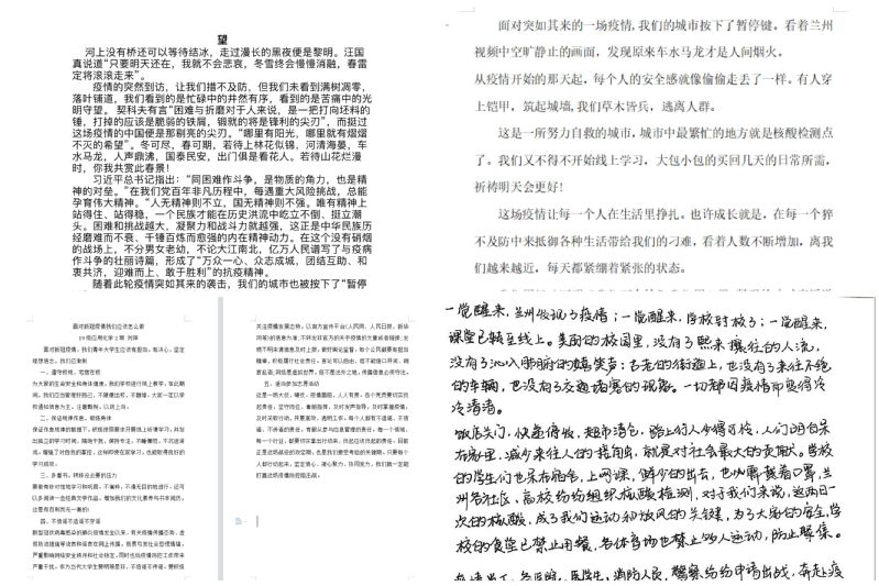 会上同学们用诗歌、散文等形式表达了自己在疫情期间的感想,并向每一位在疫情期间付出努力的人们致以崇高的敬意。张亚婷以《望》为题目,讲到:“只要每个人心中有希望,就没有一个冬天不会过去,没有一个春天不会来临。愿山河无恙,盛世如愿,人间皆安。愿所求皆所愿,所盼皆所期,一切美好如约而至。”