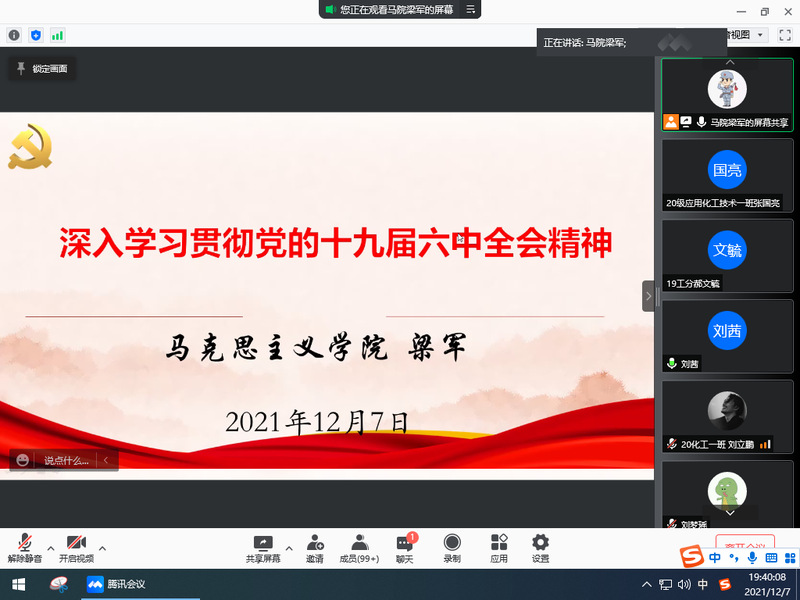 12月7日晚19:30,红足1世足球网址大全和外语学院在腾讯会议联合举办党的十九届六中全会精神宣讲报告会,邀请学校博士宣讲团成员梁军老师作宣讲,红足1世足球网址大全及外语学院学生约1000人参会,会议由学院党总支书记贺志军主持。