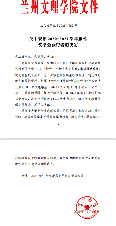 王亚宁,男,汉族,2018级应用化学2班学生。在校期间获得2020年第十届全国大学生电子商务三创挑战赛甘肃赛区省级选拔赛二等奖、校级竞赛二等奖;2020年荣获第十一届全国大学生电子商务三创挑战赛校级竞赛三等奖;主持或参与了省级、校级科研创新项目若干项;2020年带领班集体获得兰州文理学院“五四红旗团支部”和甘肃省“活力团支部”荣誉称号;2019年荣获兰州文理学院“优秀班干部”称号;2020年荣获兰州文理学院“优秀共青团员”称号;2020年荣获兰州文理学院“优良学风建设先进个人”称号;通过英语四级,计算机二级,普通话二级甲等,初中化学教师资格证等技能考试。