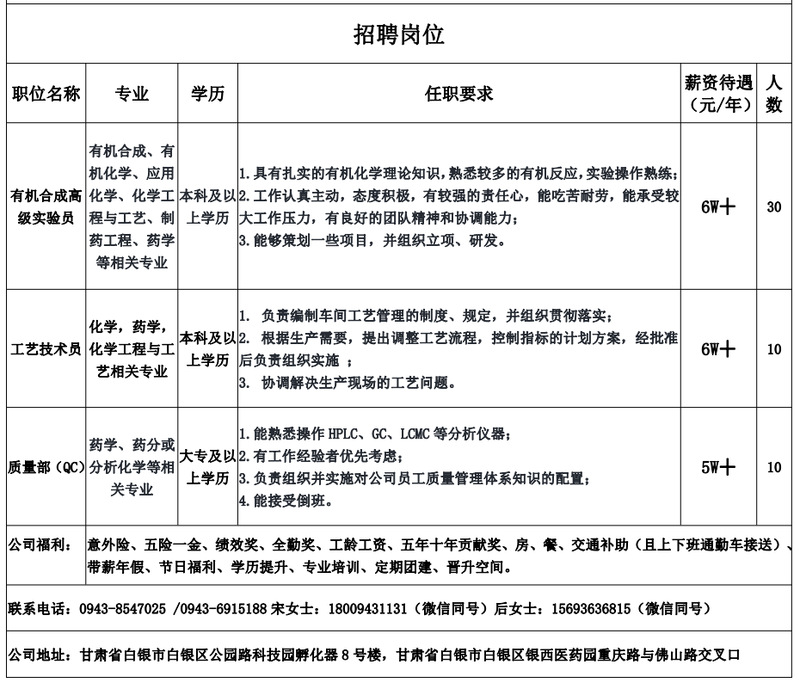 甘肃皓天医药科技有限责任公司是甘肃省内最大的专业从事化学药中间体、原料药产品研发、生产、 销售以及申报服务的高新技术企业。公司在银西生产基地建成占地 150 亩现代化生产场地,服务于原料 药生产和申报认证工作。工厂按照美国 FDA 标准建设,积极落实国家工业 2025 战略部署规划,建成了半 自动化和联网化远程监控、操作的现代化生产体系,达到美国 FDA、欧盟 COS 标准,以及日本和中国 GMP 认证的标准。是甘肃省发改委认定的甘肃省唯一一家仿制药工程研究中心。 皓天医药致力于高技术门槛的新药研发、技术服务和环保技术改造及其产业化,业务包括非专利原 料药的技术开发及创新、专利原料药的壁垒挑战、高难度医药中间体的工艺研发,优化与产业化、新药 申报技术服务以及以中药活性成分为先导的自主创新性新药研究开发工作。公司现已完成骨化醇药物, 抗抑郁药物,抗肿瘤药物以及高血压,降糖类药物等一系列特色产品;同时在催化氧化、催化氢化、催化 脱氢、催化脱水,精馏等技术上形成了公司特色优势技术。 我们秉承着精益求精,服务客户事业;创新开放,成就皓天大业; 友爱互助,凝聚团队梦想;持续 成长,实现自我价值的企业价值观念,欢迎有志人才加入皓天,共同肩负起做最好的原料药,为解决老 百姓“看病贵”做贡献的使命。皓天为大家提供展示创造的平台,每一个努力的人在这里都会收货满满 的成就和未来!