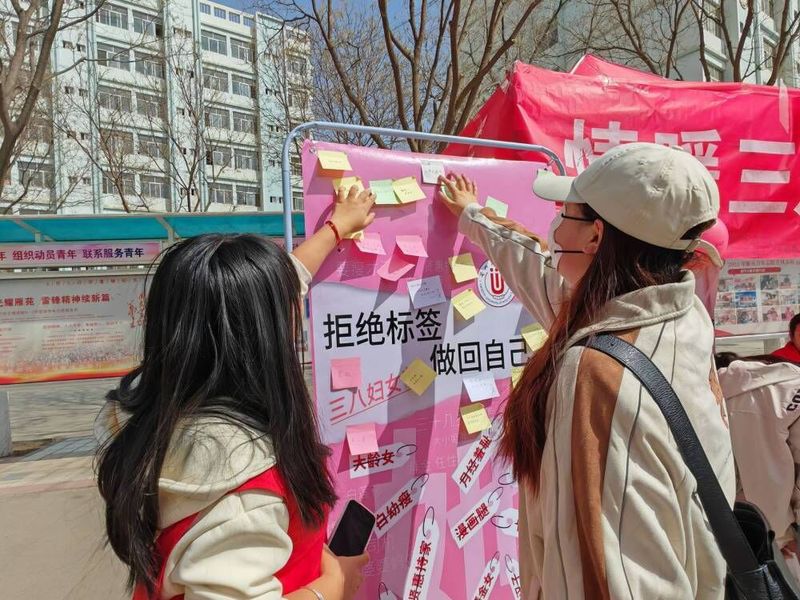 38,为切实保障女性的身心健康,表达对女教师和女大学生的关爱,学院以“撕掉标签,拒绝被定义”为主题开展活动。在活动现场,同学们亲手撕掉对于女性具有恶意和歧视的标签,再用新的便利贴写下激励女性的语句,为参加活动的每一位同学送上美好的祝愿。通过这次活动,帮助女大学生拒绝外界标签,勇敢做自己。