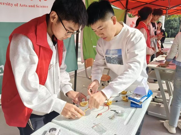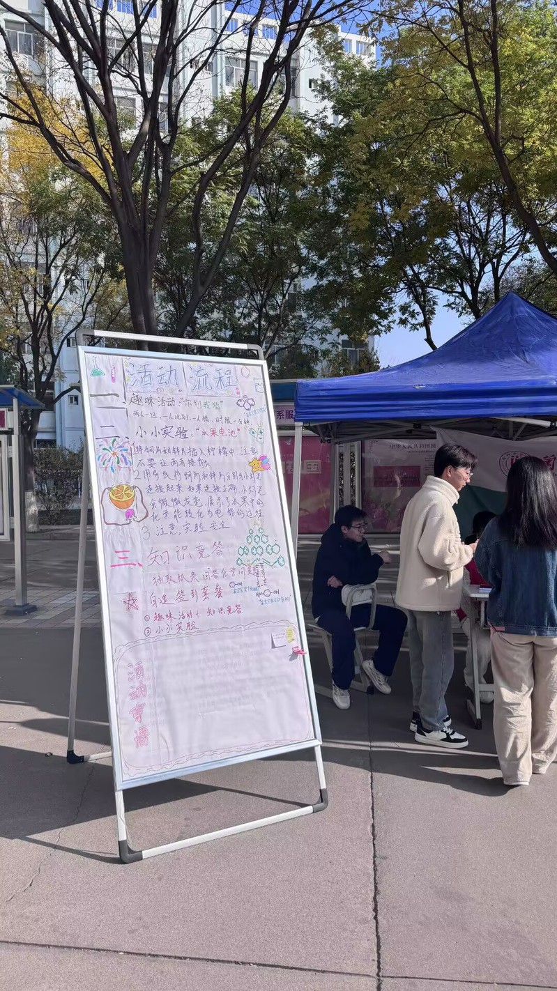 本次活动涵盖趣味游戏“你画我猜”、水果电池实验和现场答疑三个环节。在“你画我猜”环节,同学们通过肢体动作模仿化学仪器,趣味性十足,加深了大家对化学仪器的认识。水果电池实验活动中,同学们亲手连接水果电池,直观感受化学能量的转换,充分展现了化学的独特魅力。现场答疑环节则为同学们提供了深入了解化学知识、解答疑惑的良好平台。